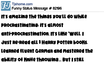 - # 78755 It's amazing the things you'll do while procrastinating; it's almost anti- procrastination. It's like "Well, I just re-read all 7 Harry Potter books learned fluent German and mastered the ability of knife throwing... But I still didn't start that essay"