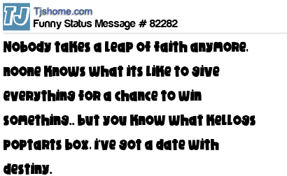 X is Nobody takes a leap of faith anymore, noone knows what its like to give everything for a chance to win something.. but you know what kellogs poptarts box, i've got a date with destiny.