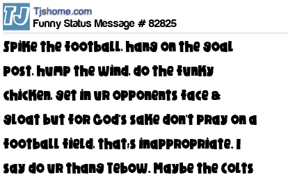 X Spike the football, hang on the goal post, hump the wind, do the funky chicken, get in ur opponents face & gloat but for God's sake don't pray on a football field, that;s inappropriate. I say do ur thang Tebow. Maybe the Colts need to do a little Tebowing