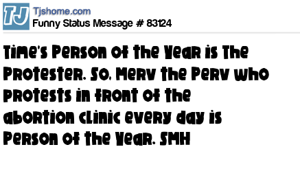 X Time's Person of the Year is The Protester. So, Merv the Perv who protests in front of the abortion clinic every day is Person of the Year. SMH