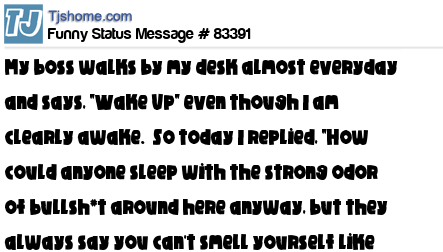X My boss walks by my desk almost everyday and says, "Wake Up" even though I am clearly awake. So today I replied, "How could anyone sleep with the strong odor of bullsh*t around here anyway, but they always say you can't smell yourself like others can."