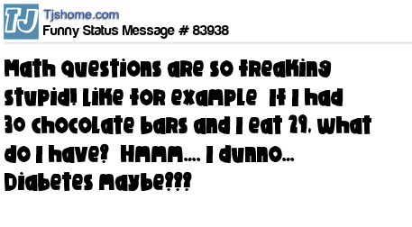 X Math questions are so freaking stupid! Like for example “If I had 30 chocolate bars and I eat 29, what do I have?” Hmmm…. I dunno… Diabetes maybe???