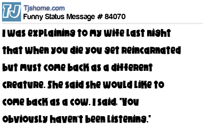 - # 105124 I was explaining to my Boss last night that when you die you get reincarnated but must come back as a different creature. She said she would like to come back as a cow. I said, "You're obviously not listening."