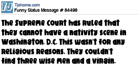 X is The Supreme Court has ruled that they cannot have a nativity scene in Washington, D.C. This wasn't for any religious reasons. They couldn't find three wise men and a virgin.