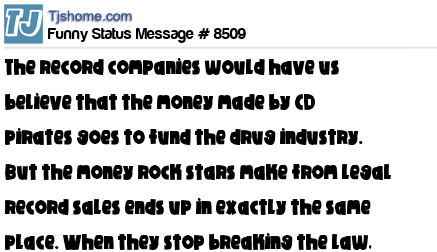 X The record companies would have us believe that the money made by CD pirates goes to fund the drug industry. But the money rock stars make from legal record sales ends up in exactly the same place. When they stop breaking the law, so will I.