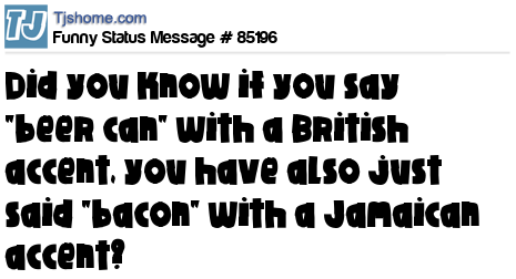 - # 54057 Did you know? When you say 'beer can" in a British accent you're also saying "bacon" in a jamaican accent.