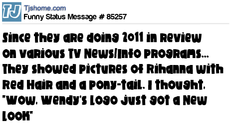 X Since they are doing 2011 in review on various TV News/Info programs... They showed pictures of Rihanna with Red Hair and a pony-tail. I thought, "Wow, Wendy's Logo just got a New Look"