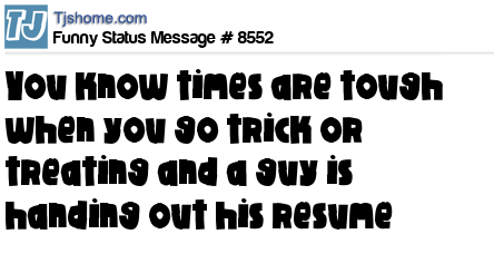 X says You know times are tough when you go trick or treating and a guy is handing out his resume