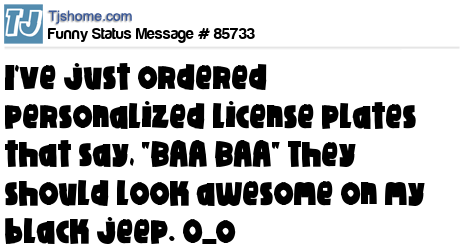 X is I've just ordered personalized license plates that say, "BAA BAA" They should look awesome on my black jeep. O_o