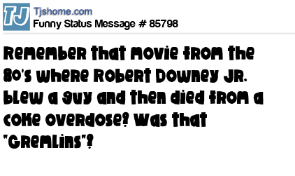 X Remember that movie from the 80's where Robert Downey Jr. blew a guy and then died from a coke overdose? Was that "Gremlins"?