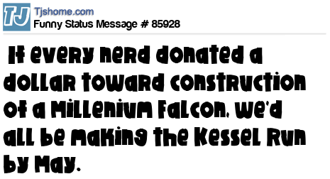 X says If every nerd donated a dollar toward construction of a Millenium Falcon, we'd all be making the Kessel Run by May.