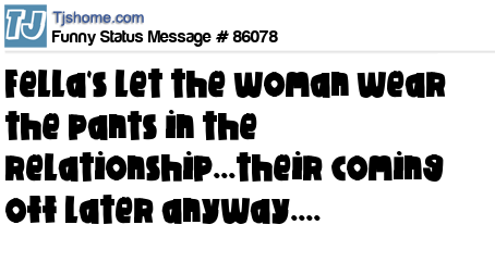 - # 85193 Fellas: Let a woman wear the pants in a relationship. They are coming off later anyways!