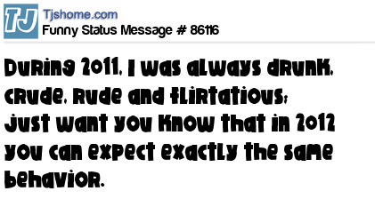 X says During 2011, I was always drunk, crude, rude and flirtatious; just want you know that in 2012 you can expect exactly the same behavior.