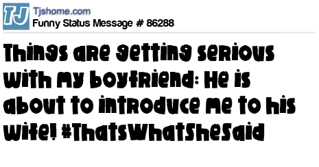 X says Things are getting serious with my boyfriend: He is about to introduce me to his wife! #ThatsWhatSheSaid