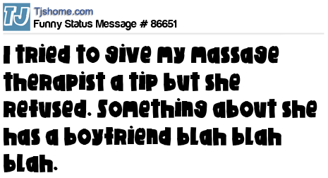 X I tried to give my massage therapist a tip but she refused. Something about she has a boyfriend blah blah blah.
