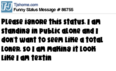 - # 124621 Please ignore this status. I'm standing in public alone and I don't want to seem like a total loner, so I'm making it look like I'm texting.