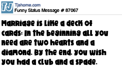 - # 172928 Marriage Is Like A Deck of cards, In the beginning all you need is a Two Hearts and a Diamond, As it Progresses You Wish You Had A Club and A Spade