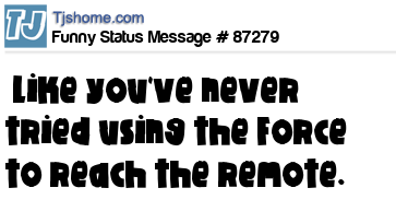 - # 67835 I'm so exhausted from work that I actually tried to use "The Force" to get the remote to come to me. When it didn't work I used the old Jedi Mind Trick sayin "These arent the droids your looking for give me the remote". My son did while rollin his eyes.