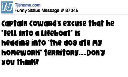 X says Captain Coward's excuse that he "fell into a lifeboat" is heading into "the dog ate my homework" territory.....Don'y you think?
