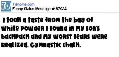 - # 196547 My brother in-law just called with some terrible news.. He tasted a bag of white powder he found in his son's backpack and his worst fears were realized... Gymnastic chalk.