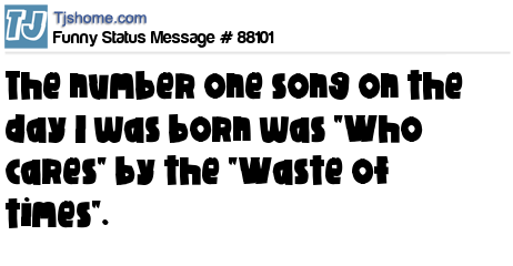 - # 87774 Instead of knowing what the #1 song was when you were born it would be cool if it could tell you what the #1 song will be when you die. That way when you start hearing it on the radio, you'll know that the end is near.
