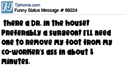 X says there a Dr. in the house? Preferably a surgeon? I'll need one to remove my foot from my co-worker's ass in about 5 minutes.