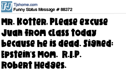 X is Mr. Kotter, Please excuse Juan from class today because he is dead. Signed: Epstein's Mom. R.I.P. Robert Hedges.