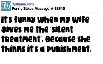 - # 188364 It's funny, when my wife gives me the silent treatment. She actually thinks it's a punishment.