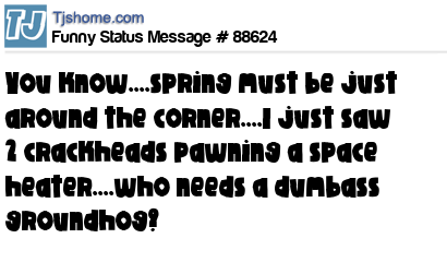 - # 21039 It must be spring, I just saw 2 crackheads pawning a space heater. Who needs a groundhog?