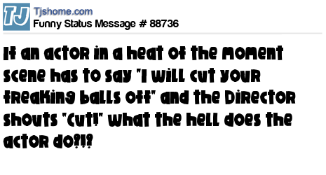 X says if an actor in a heat of the moment scene has to say "I will cut your freaking balls off" and the Director shouts "Cut!" what the hell does the actor do?!?