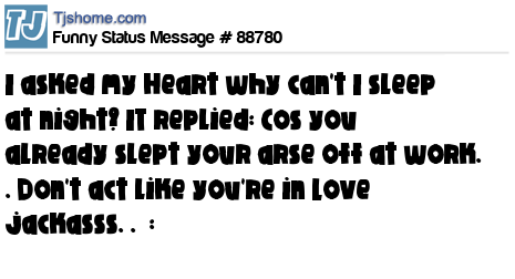 X says I asked my Heart why can't I sleep at night? IT replied: Cos you already slept your arse off at work. . Don't act like you're in Love jackasss. . :|