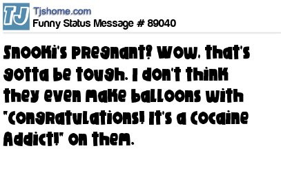 X Snooki's pregnant? Wow, that's gotta be tough. I don't think they even make balloons with "Congratulations! It's a Cocaine Addict!" on them.