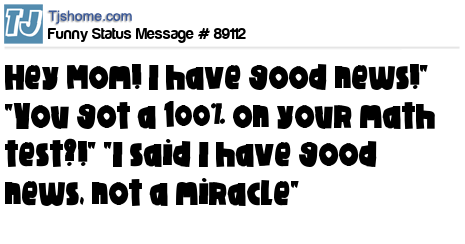 X is Hey Mom! I have good news!" "You got a 100% on your math test?!" "I said I have good news, not a miracle"
