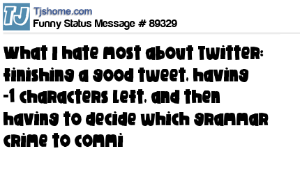 X says What I hate most about Twitter: finishing a good tweet, having -1 characters left, and then having to decide which grammar crime to commi