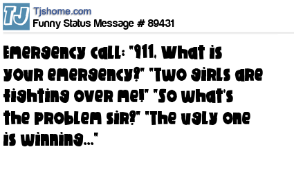 - # 76585 MAN: Hello! Is this 911? POLICE: Yes! What's Ur emergency??! MAN: Two girls are fighting over me! POLICE: What's wrong with that??! MAN: The ugly one is winning.... Hurry!!!