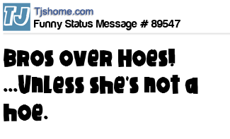 - # 204616 Personally, I don't believe in Bros Before Hoes or Hoes Before Bros. There needs to be a balance. Sort of a homie-hoe-stasis.