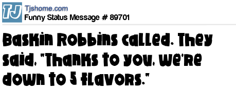 - # 175770 I need to lose weight. Baskin-Robbins just called my mom and told her because of me they're down to only 5 flavors.