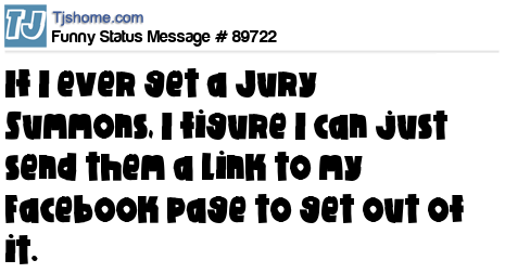 X says If I ever get a Jury Summons, I figure I can just send them a link to my Facebook page to get out of it.