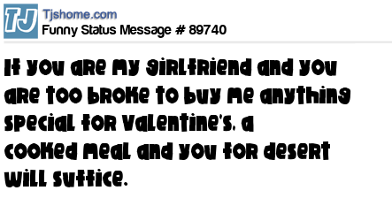 X says If you are my girlfriend and you are too broke to buy me anything special for Valentine's, a cooked meal and you for desert will suffice.