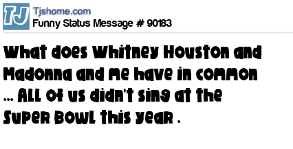 X What does Whitney Houston and Madonna and me have in common ... All of us didn't sing at the Super Bowl this year .