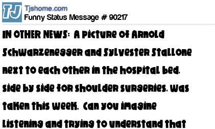X IN OTHER NEWS: A picture of Arnold Schwarzenegger and Sylvester Stallone next to each other in the hospital bed, side by side for shoulder surgeries, was taken this week. Can you imagine listening and trying to understand that conversation?