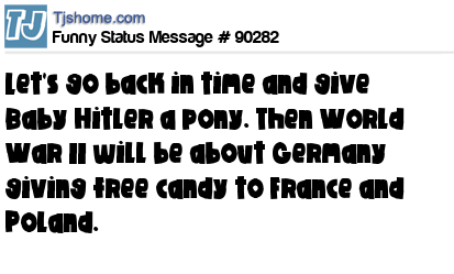 X Let's go back in time and give Baby Hitler a pony. Then World War II will be about Germany giving free candy to France and Poland.