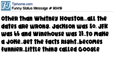 X says Other than Whitney Houston...all the dates are wrong. Jackson was 50, JFK was 46 and Winehouse was 27..to make a joke..get the facts right..becomes funnier..Little thing called Google