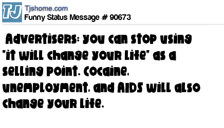 X Advertisers: you can stop using "it will change your life" as a selling point. Cocaine, unemployment, and AIDS will also change your life.