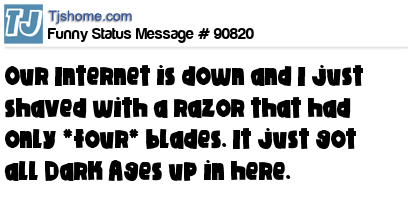 X Our Internet is down and I just shaved with a razor that had only *four* blades. It just got all Dark Ages up in here.