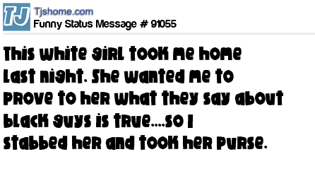- # 81203 This white girl took me home last night. She wanted me to prove to her what they say about black guys is true....so I stabbed her and took her purse.