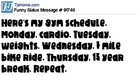 X Here's my gym schedule. Monday, cardio. Tuesday, weights. Wednesday, 7 mile bike ride. Thursday, 15 year break. Repeat.