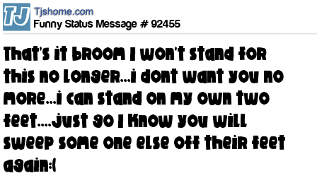 X is that's it broom I won't stand for this no longer...i dont want you no more...i can stand on my own two feet....just go I know you will sweep some one else off their feet again:(