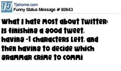- # 89329 What I hate most about Twitter: finishing a good tweet, having -1 characters left, and then having to decide which grammar crime to commi