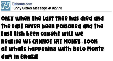 X Only when the last tree has died and the last river been poisoned and the last fish been caught will we realise WE CANNOT EAT MONEY.. look at whats happening with Belo Monte dam in Brazil
